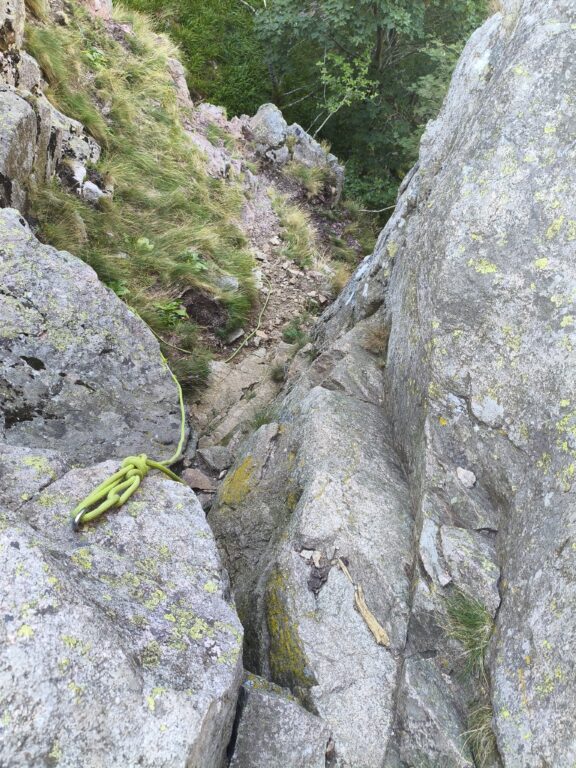 - L3 (5a)/ plutôt 5c ! : Remonter une cheminée caractéristique et bien visible, attention l'équipement est espacé et il faut être à l'aise dans ce niveau. On sort sur une terrasse au niveau d'une via cordata. Relais sur la broche de la via cordata.