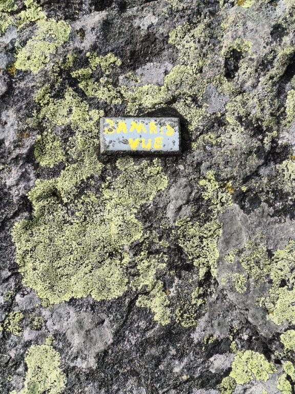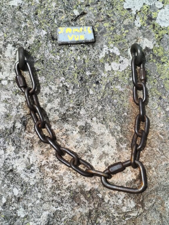 En rappel : Sinon rejoindre le rappel de la voie "jamais vu" sur la droite soit par un sentier qui part sur la droite, soit en montant un peu et en suivant la crête. On trouve alors un relais chaîné avec le nom de la voie au dessus.