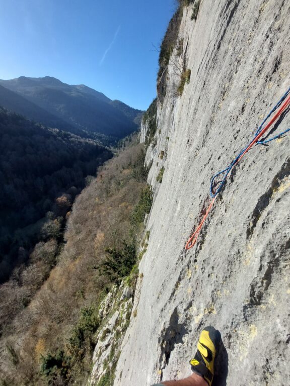 - L3 (6a, 20m) : La longueur clé de la voie. Une dalle verticale avec des prises franches, qui demande de bien placer les pieds.