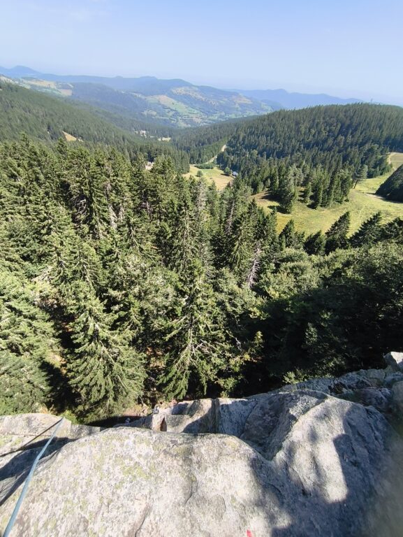 Le Bouclier du Tanet, situé près de Soultzeren dans les Vosges, est un site d’escalade naturel offrant un caractère alpin