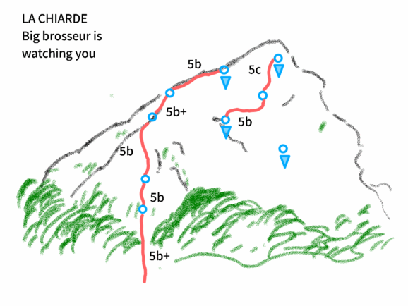 • L1 ( 5b+) : première longueur qui monte droit, un pas en milieu de voie